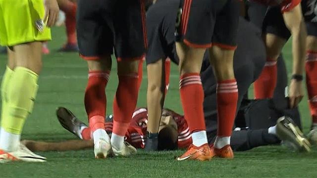 ومع صافرة نهاية المباراة من حكم اللقاء شوهد سقوط محمود عبد المنعم كهربا على أرضية الملعب ودخل الجهاز الطبي لعلاجه.