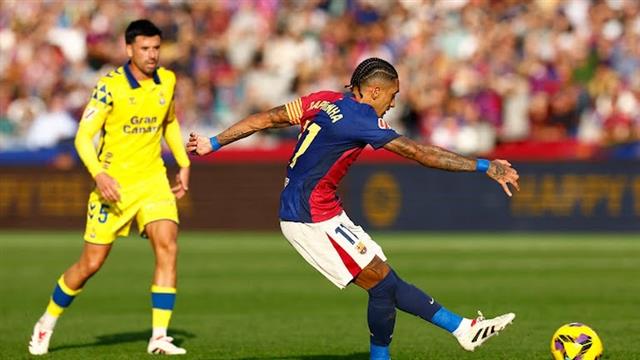 تمكن الدولي البرازيلي، رافينيا، من تسجيل هدف التعادل لفريق كرة القدم الأول بنادي برشلونة، في مواجهة لاس بالماس المقامة بينهما الآن.
